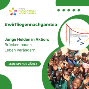 Wir laden Sie herzlich ein, Teil dieser bemerkenswerten Reise zu sein und direkt zu ihrer Verwirklichung beizutragen. Durch Ihre Spende an das Projekt #wirfliegennachgambia ermöglichen Sie nicht nur eine große Erfahrung für die Schüler der Gesamtschule Emmerich, sondern tragen auch zur weiteren Entwicklung und zum Wohl der Gemeinde in Gambia bei.