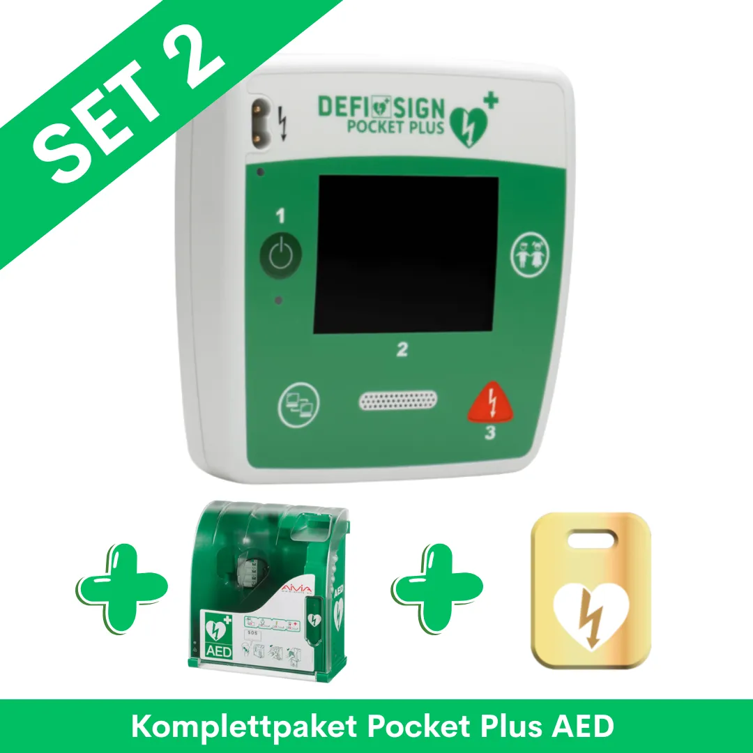 AED-Komplettpaket 2 Premium mit DefiSign Pocket Plus AED, AIVIA 100 Wandschrank und Gold Wartungsvertrag