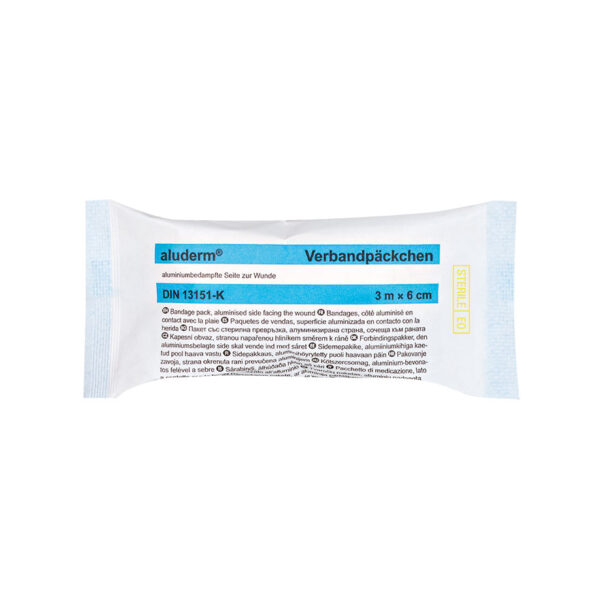 Im Lieferumfang enthalten ist ein steriles Aluderm Verbandpäckchen DIN 13151, bestehend aus einer aluminisierten Wundauflage und einer elastischen Fixierbinde. Alle Komponenten sind hygienisch verpackt und sofort einsatzbereit.