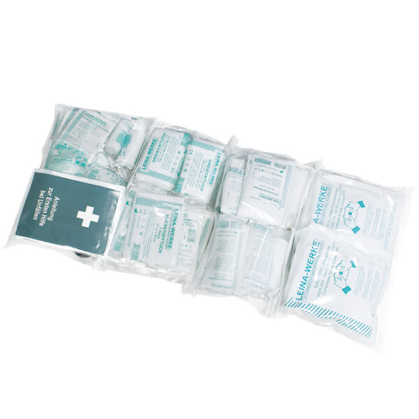 Das Set enthält u.a. 2 Heftpflasterspulen (5m x 2,5cm), 36 Wundschnellverbände verschiedener Größen, 10 Verbandpäckchen, 12 sterile Wundkompressen, 8 Fixierbinden, 4 Dreiecktücher und 1 Schere. Alle Produkte sind CE-zertifiziert und entsprechen den geltenden Medizinprodukterichtlinien.