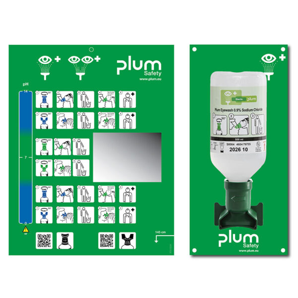 Die Plum Augenspülstation besteht aus einer robusten Wandhalterung, die eine 500 ml Flasche sterile Augenspüllösung sicher aufbewahrt. Die 0,9%ige Natriumchloridlösung entspricht dem natürlichen Salzgehalt der Augenflüssigkeit und ist daher besonders schonend und effektiv bei der Spülung von Verunreinigungen oder chemischen Substanzen.